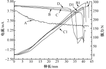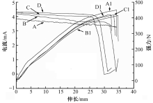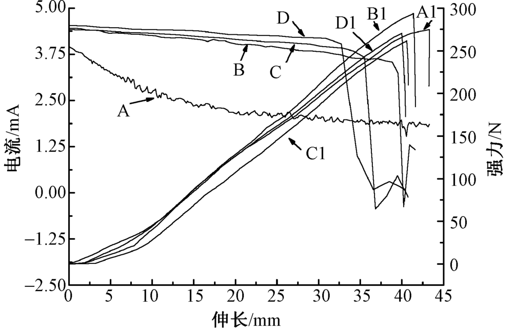 织物纬向拉伸对电流的响应 注:A1、B1、C1、D1分别为速度等于20、100、200、300 mm/min时的拉伸曲线;A、B、C、D分别为对应的电流曲线。"
