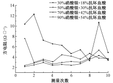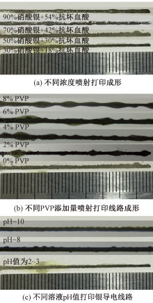 为制备具有良好导电特性的柔性线路,研究了织物表面微滴喷射打印化学沉积的工艺条件变化对成形导电线路性能的影响。利用开发的气动式双喷头微滴按需喷射系统,通过改变反应溶液中硝酸银和抗坏血酸的用量、分散剂聚乙烯吡络烷酮(PVP)的浓度及反应体系的pH值,在系统稳定喷射条件下打印导电线路,对不同条件下成形导线的微观形貌进行观察,并测试成形导线的方阻。结果表明:在稳定喷射条件下,当硝酸银和抗坏血酸用量分别为50%和30%(质量体积比)时,反应生成的银导线平均方阻为2.92 Ω/□,标准差为0.46 Ω/□;分散剂PVP在银导线反应过程中具有控制银微粒大小和改善粒子间团聚的作用,且当分散剂PVP添加量为6%时,银颗粒成“米粒”状,颗粒间连接成网状结构;不同pH值条件下反应体系的反应情况不同,当反应体系的pH值为2~3时,反应生成银粒子较多,且颗粒形状规则统一。