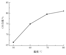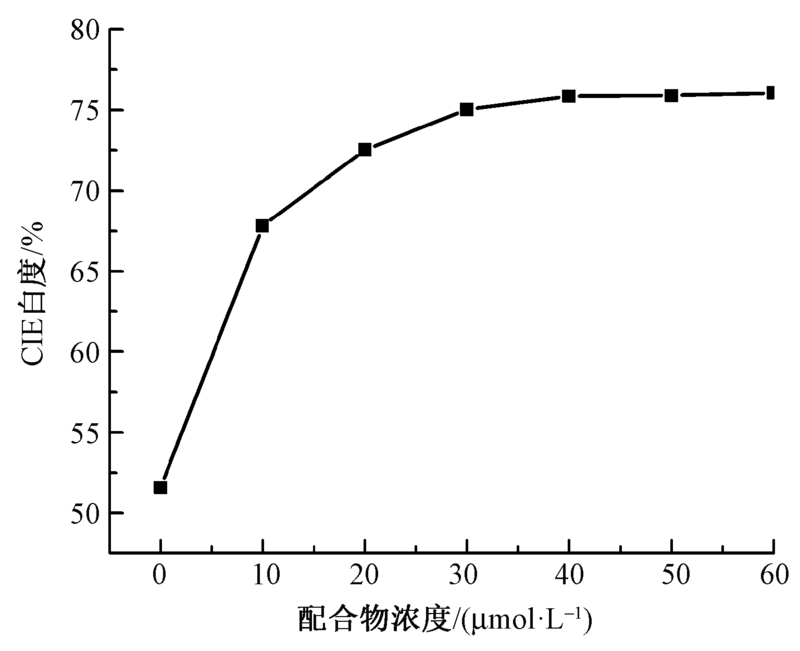 针对传统棉织物高温漂白过程中能耗过高的问题,采用含亚氨基二乙酸、二价铜离子和吡啶衍生物的铜配合物作为双氧水低温漂白的催化剂,构建棉针织物的新型低温漂白体系。探讨了温度、配合物浓度、漂白时间、烧碱质量浓度、双氧水质量浓度等因素对棉针织物漂白效果的影响,同时研究了木质素模型化合物对香豆酸的降解过程,进而推测出该铜配合物催化剂催化漂白棉针织物的机制。通过单因素试验,得到优化漂白工艺:金属配合物浓度为30 μmol/L, H2O2(30%)质量浓度为10 g/L,渗透剂JFC质量浓度为2 g/L,精练剂质量浓度为2 g/L,浴比为1∶30,60 ℃条件下处理60 min。结果表明,在不含碱的中性条件下,经过处理织物白度可达75.03%,且顶破强力损失较小。