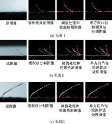 为实现丝饼毛羽的自动检测,提出基于机器视觉的丝饼毛羽检测方法,通过寻找毛羽轮廓点中凸包位置实现丝饼毛羽检测。首先构建具有特定结构特征的卷积核,利用该卷积核对原始图像进行卷积运算,从而获取毛羽特征,并采用阈值处理对其进行二值化;然后对二值化后的毛羽进行轮廓检测,继而筛选轮廓点以减少运算时间;最后利用单方向凸包算法对满足条件的轮廓点进行检测,实现对丝饼毛羽的定位及计数。运用3类典型丝饼毛羽对检测方法进行验证,结果表明,该方法可有效地实现对丝饼毛羽准确定位并计数,且对不同背景的毛羽图片有较强的适应性。