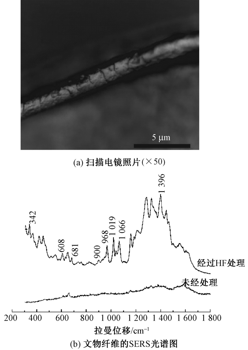 为快速检测古代纺织品文物中的天然色素并达到无损分析的目的,采用表面增强拉曼光谱技术(SERS)对纺织品文物中天然染料茜素和茜紫素进行鉴定。以纳米银溶胶为SERS基底检测茜素和茜紫素的标准品,利用密度泛函理论计算结果对茜素和茜紫素分子的SERS光谱进行确认,分析得到茜素和茜紫素的SERS光谱在3种激发波长下的差异,并找出判断茜素和茜紫素存在的特征峰。在此基础上,从纺织品文物中提取1根长度约为2 mm的纤维,采用原位非萃取水解方法对其进行预处理,并进行SERS检测。结果表明,出土于新疆营盘的纺织品文物中红色染料成分是茜素和茜紫素。