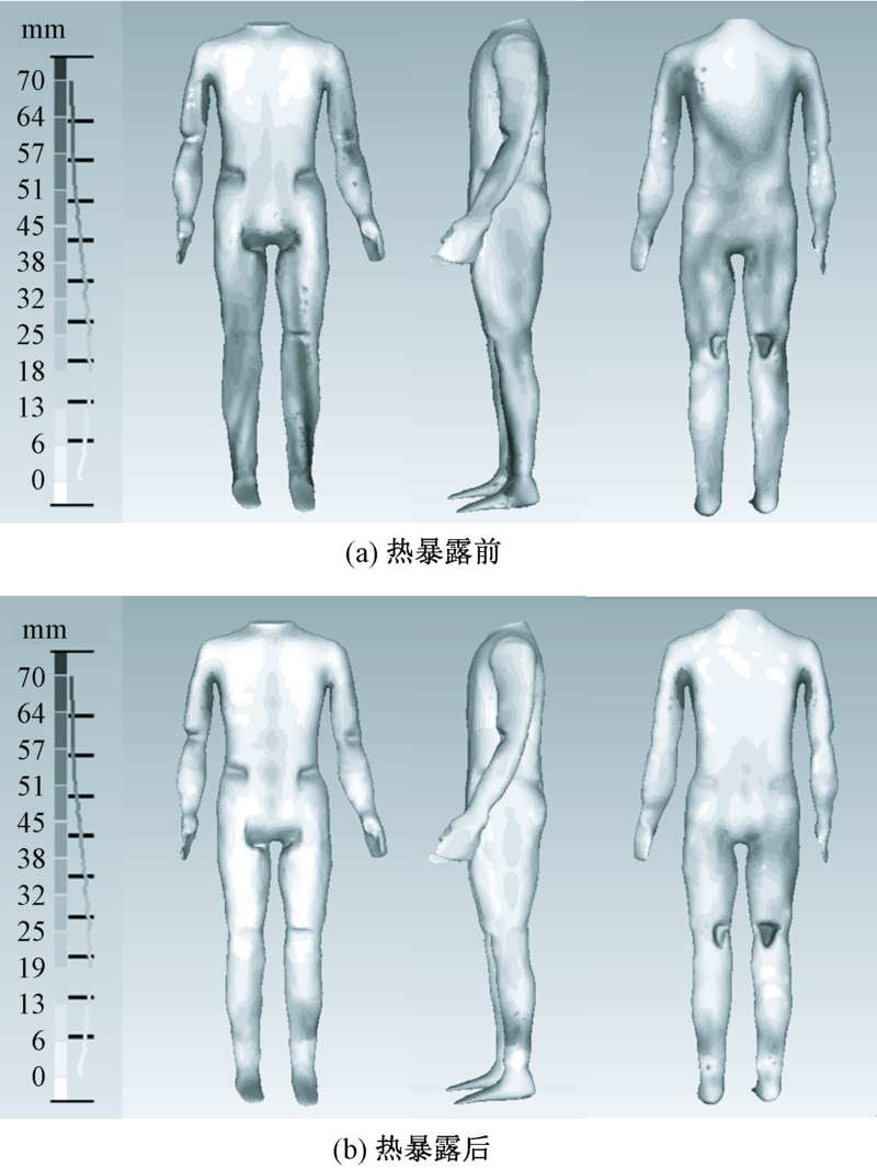 为准确获取燃烧假人测试中防火服热暴露前后衣下空气层厚度及其分布,提出一种基于三维现场扫描的测量和表征方法。利用Kinect深度相机,通过在燃烧假人室内构建扫描平台,现场获得假人裸体及着装状态点云数据;基于Geomagic逆向工程软件进行三维建模、对齐和比较,并通过实现假人表面传感器在三维空间的准确定位,快速有效地表征衣下空气层厚度及分布。经验证发现:即使是相同的服装每次穿着后衣下空气层分布也存在较大差异;背部区域热暴露前后空气层厚度平均变异系数分别达到46%、35%。结果表明,以往异地扫描获得的数据难以准确反映燃烧测试时的真实状态,现场扫描更有利于准确分析因服装材料、规格、高温收缩等因素导致的衣下空气层变化对热防护性能的影响。
