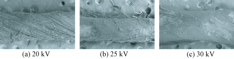 不同电压下制备的纳米纱线的扫描电镜照片(×70)"