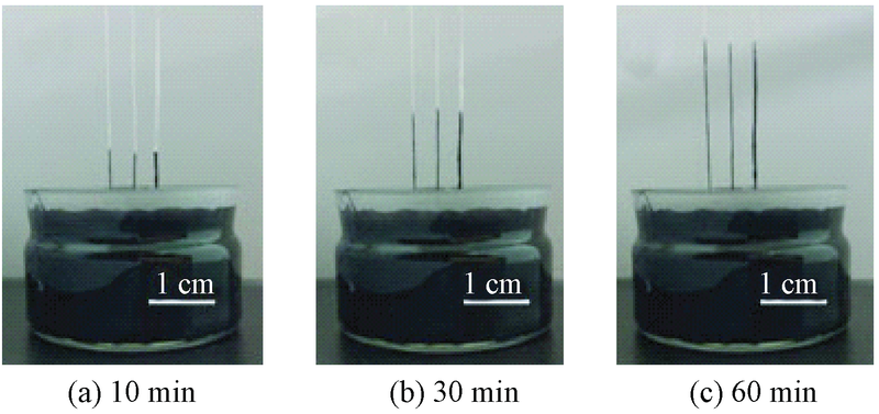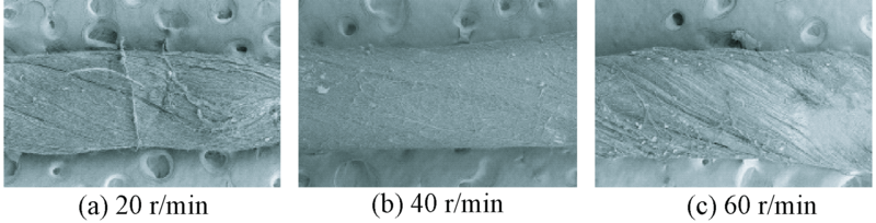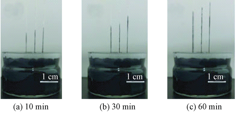 不同接收器转速下纳米纱线的芯吸高度 注:每个图中接收器转速自左向右分别为20、40 和60 r/min。"