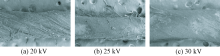 不同电压下纳米纱线的芯吸高度 注:每个图中纺丝电压自左向右分别为20、25和30 kV。"