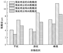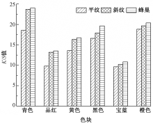 为探究织物组织结构与喷墨印花效果的关系,选择平纹、斜纹和蜂巢织物为研究对象,对3种织物进行相同的冷轧堆前处理、预处理和喷墨印花,测试了织物的粗糙度、厚度、孔隙率、颜色深度和印花清晰度;分析了预处理对织物组织结构的影响,以及织物组织结构与颜色深度和印花清晰度的关系。结果表明:平纹织物的经向粗糙度、纬向粗糙度、厚度和孔隙率分别为6.4 μm、9.1 μm、0.65 mm和85.5%,斜纹织物比平纹织物分别增加了22%、30%、25%和2.5%,而蜂巢织物比平纹织物分别增加了50%、53%、150%和3.4%;冷轧堆处理和预处理后的平纹、斜纹和蜂巢织物的经纬向粗糙度、孔隙率减小,织物厚度增加;平纹织物的表观颜色最浅、印花清晰度最好,斜纹织物次之,蜂巢织物的表观颜色最深,印花清晰度最差。