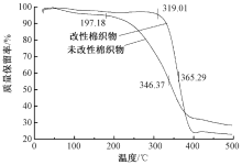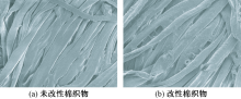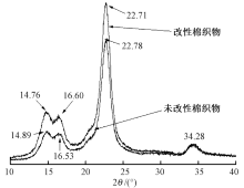 为提高棉织物的力学性能和热稳定性,采用互穿聚合物网络(IPN)技术,制备了聚N-异丙基丙烯酰胺/丝胶IPN水凝胶;并以戊二醛(GA)为交联剂,通过浸渍法将IPN水凝胶用于棉织物的改性整理。采用傅里叶变换红外光谱仪、扫描电子显微镜、差示扫描量热仪、X射线衍射仪、热失重分析仪和万能材料拉力机对改性棉织物进行测试和表征。结果表明:IPN水凝胶的最低临界溶液温度为30.79 ℃;改性棉织物表面和纤维之间形成一层改性凝胶膜,但其结晶2θ角没有偏移;改性棉织物的断裂强度、断裂伸长率和弹性模量分别提高了29.39%、35.24%和17.58%,分解温度提高了61.79%。