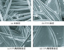 为提高芳纶过滤材料的过滤效率,以添加不同质量分数纳米陶瓷粉的聚四氟乙烯乳液为涂层剂主要原料,采用发泡剂发泡涂层法对芳纶材料进行表面涂层处理。研究了泡沫涂层对芳纶过滤材料的结构、耐摩擦性、透气性、孔径大小、拒水拒酸碱性以及过滤性能的影响。结果表明:经发泡涂层整理后,芳纶表面形成一层致密薄膜;纳米陶瓷粉质量分数越大,发泡剂发泡效果越好,薄膜愈致密且稳定,同时芳纶过滤材料的耐摩擦性愈好,其孔径大小及透气性略有下降;涂层提高了芳纶的拒酸、拒碱性能,有效减少了滤袋的糊袋,使其清灰性及使用寿命均有所提升;涂层后芳纶的过滤效率显著提高,过滤直径为1 μm以上颗粒物的过滤效率由39.1%提升到60%左右,且过滤直径为10 μm以上颗粒物的过滤效率可达到100%。