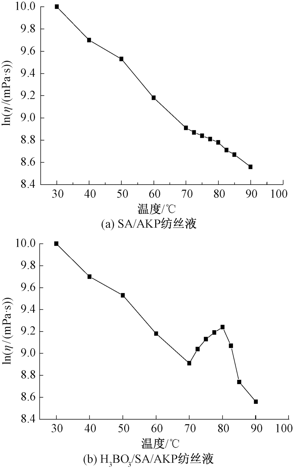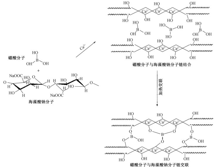 为增强海藻酸钠/磷虾蛋白(SA/AKP)复合纤维的综合性能,以硼酸为交联剂对海藻酸钠/磷虾蛋白复合纤维进行交联改性,探究了复合体系的最佳交联温度和分子间相互作用,并对改性纤维的热稳定性、力学性能和动态力学性能等进行表征。结果表明:硼酸对海藻酸钠/磷虾蛋白复合体系中分子内氢键具有明显的影响,硼酸分子与海藻酸钠分子链上的羟基发生脱水缩合反应实现交联,交联温度为80 ℃;随着硼酸加入量的增加,复合纤维的热稳定性变化不大,力学性能和储能模量逐渐提高,当体系中硼酸的质量浓度为1.5 g/L时,纤维的断裂强度有所提高,达到2.58 cN/dtex,比改性前提高了11.3%。
