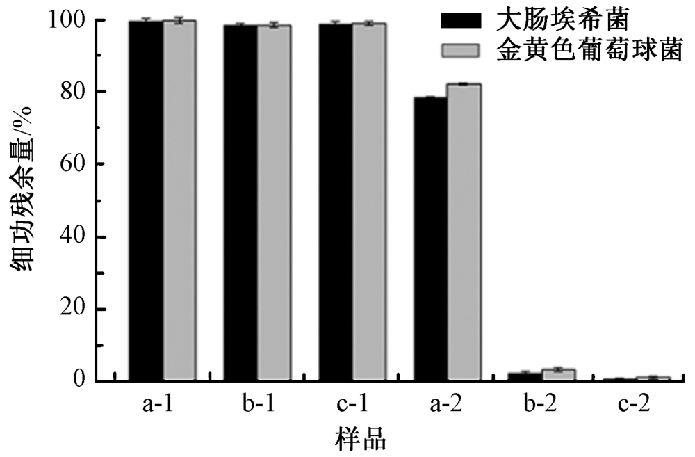 不同涂层织物培养皿中细菌残余 1—黑暗条件; 2—可见光条件。"