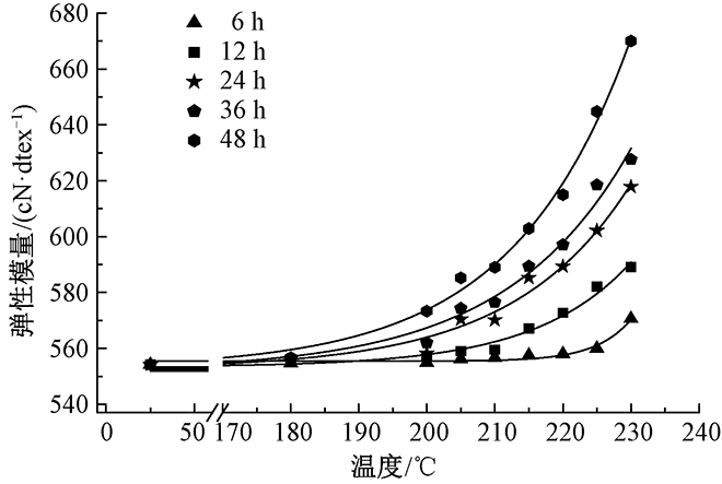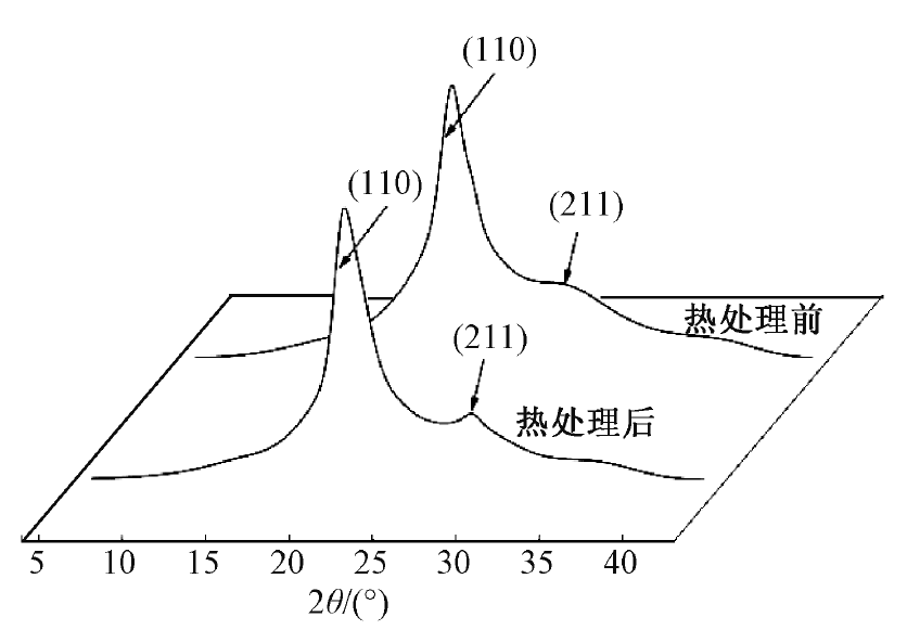 针对热致液晶聚芳酯(TLCPAR)初生纤维结构不稳定、强度不高的问题,对其进行热处理以提高纤维分子质量,进而提高纤维的强度。将处于松弛状态的TLCPAR纤维置于热处理箱中,在不同的热处理温度和时间下进行热处理。借助广角X射线衍射仪、纱线强伸度仪测试与分析纤维的结晶度、晶粒尺寸、晶区取向以及纤维力学性能的变化。结果表明:热处理后TLCPAR纤维的(110)晶面和(211)晶面的晶粒尺寸显著增加,230 ℃热处理48 h后纤维的结晶度增加了37.1%,取向度仅下降2%,说明TLCPAR纤维中大分子链的堆砌更有序、更紧密;热处理后结构变化使TLCPAR纤维断裂强度增加了86.8%,弹性模量增加了20.9%。