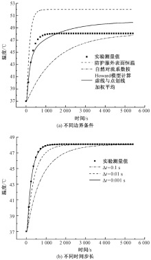 为得到相对精确的热防护服非稳态隔热性能预测数值,基于传热系统的非稳态传热模型,在防护服材料外表面分别为恒温边界条件和Howard模型对流边界条件下,利用有限差分法分别计算了2种边界条件下模拟皮肤处温度的时程曲线,所得结果均与实验测量值差别较大。在细致分析传热过程的基础上,综合运用傅里叶定律、牛顿冷却定律、以及Howard模型对流边界条件,在线化假设下提出了一种自然对流换热系数计算方法,代入非稳态模型后利用有限差分法进行了求解,随着时间步长的加密,计算结果迅速向实验测量值收敛,当时间步长为0.001 s时,计算结果与测量结果误差小于0.1 ℃。