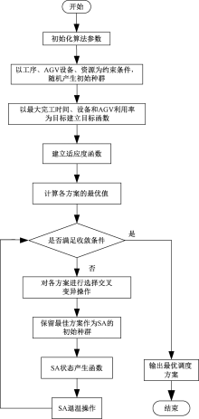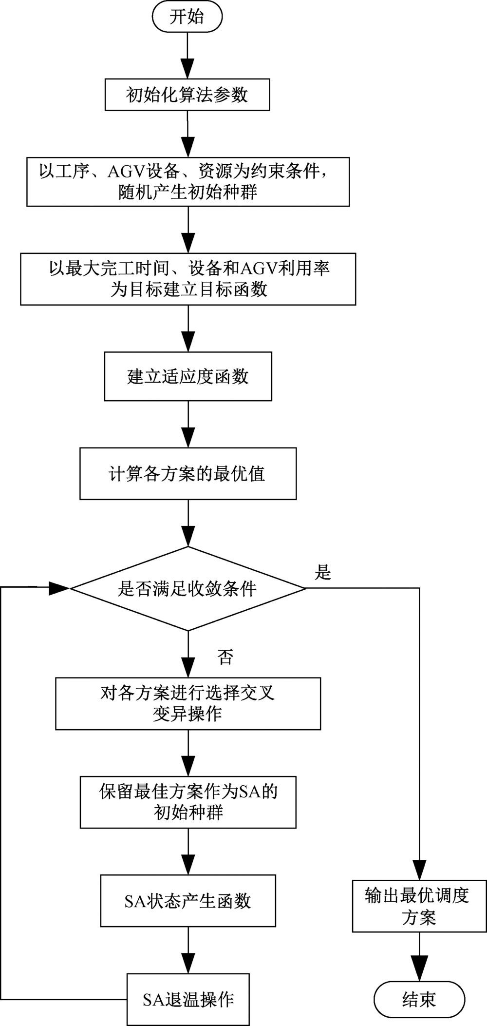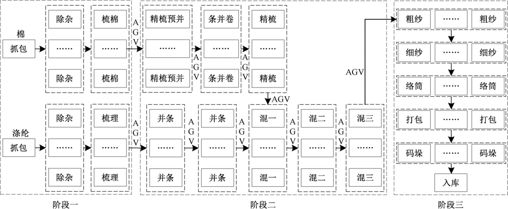 为解决有自动引导运输车(AGV)的环锭纺纱车间协同调度系统多种约束条件下的调度问题,在考虑工艺、加工设备资源、AGV资源以及批处理4种约束条件的情况下,建立了满足最大完工时间最小化和设备利用率最大化的AGV纺纱车间协同调度模型。针对模拟退火和遗传算法计算效率低和易陷入局部最优解的缺点,提出了基于模拟退火遗传算法的纺纱车间调度模型求解算法。实验结果表明:当给定条筒为50个时,同等环境下,基于模拟退火遗传算法的调度方案要比普通的模拟退火和遗传算法的最大完工时间分别减少了1 162 s和 1 619 s,纺纱车间的设备和AGV的利用率也分别提高了将近12%和11%。该方法在提升环锭纺纱车间运行效率方面具有一定的应用价值。