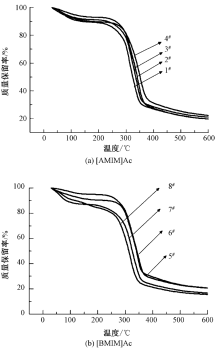 为探究离子液体法制备再生纤维性能的影响因素,选用有机溶剂二甲基亚砜(DMSO)分别与离子液体1-烯丙基-3-甲基咪唑醋酸盐([AMIM]Ac)和1-丁基-3-甲基咪唑醋酸盐([BMIM]Ac)构成复配体系作为溶剂溶解竹纤维素浆泊,用湿法纺丝制备再生纤维素纤维,并借助扫描电子显微镜、热性能分析、X射线衍射等手段对再生纤维进行形貌、结构分析和力学性能测试。结果表明:当DMSO含量提高、纺丝原液中离子液体含量降低,再生纤维丝表面的光洁程度和热稳定性先提高后下降,力学性能下降;当竹纤维素含量提高,再生纤维丝的表面更光滑,结晶度、热稳定性、断裂强度提高,纤维直径均变粗;离子液体[AMIM]Ac制得的再生纤维性能较优。