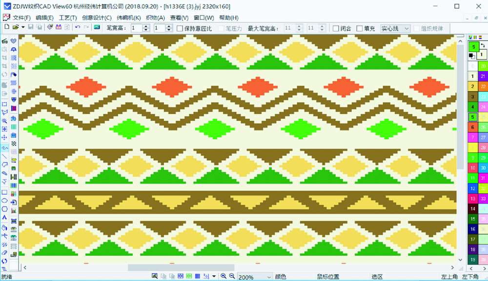 为优化多经多纬织物的工艺设计,研发并实现了纹织工艺处理的简洁设计模式。简洁设计模式的设计原理是将常规纹织CAD工艺设计纹织组织表中意匠图颜色号与梭号对应的二维关系转化为一维线性关系。在具体的意匠图工艺设计阶段,采用合成组织,由一色对应多个组织简化为一色对1个合成组织,并且引入梭位和空梭概念,在投梭设计上按梭位进行投梭。二重经二重纬加抛花纹织工艺实践表明:运用简洁设计模式,只需设计6个结构简单的合成组织,即可完成原来需要设计的60个简单组织,极大地简化了多经多纬复杂组织的设计过程。