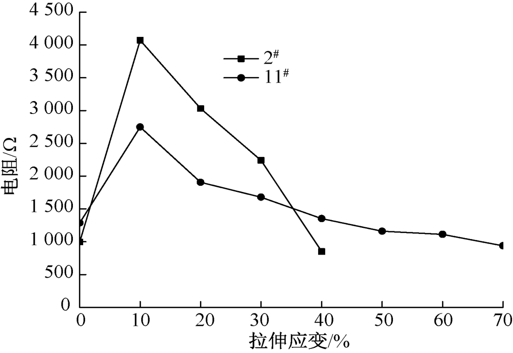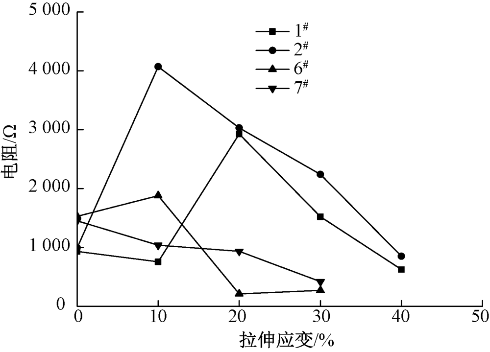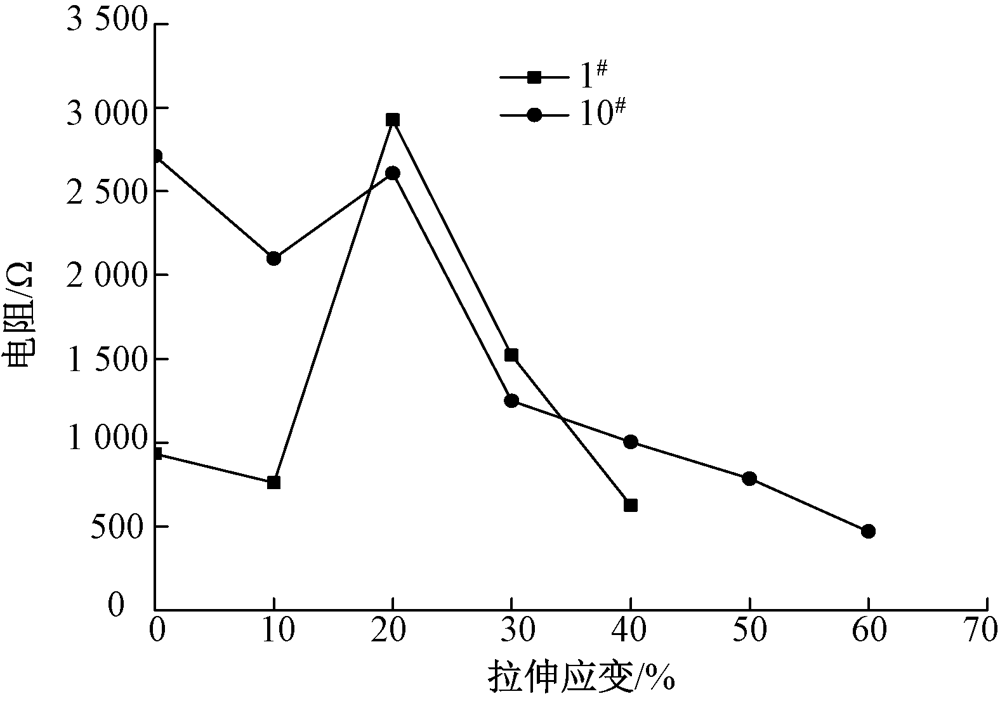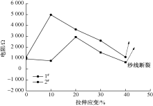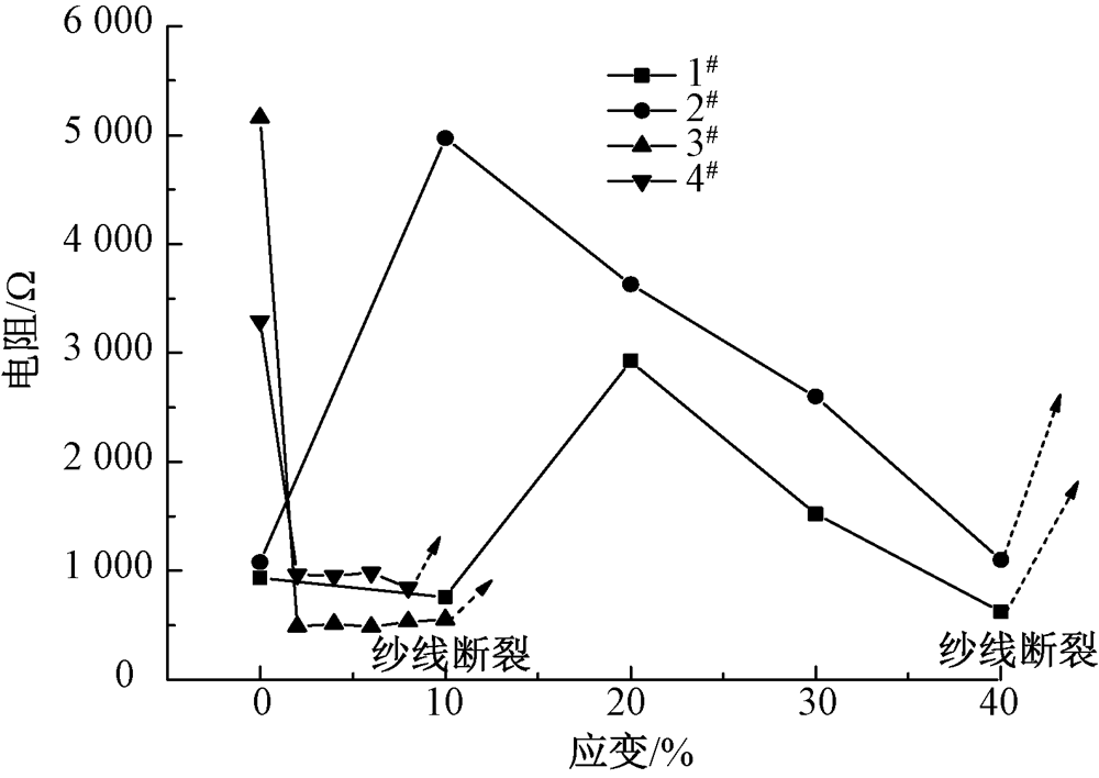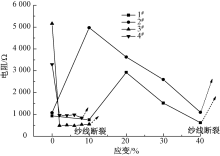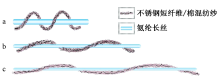 为开发兼具弹性和导电性能的电磁功能纱线,以氨纶为芯丝、外包不锈钢短纤维/棉混纺纱,研制系列弹性不锈钢短纤维/棉包覆氨纶纱。在Instron 5566万能试验机上,结合万用表,获得弹性纱线的应力-应变、应变-电阻以及定伸长弹性回复曲线,研究纱线在不同拉伸状态下的电学性能。结果表明:不锈钢短纤维/棉包覆氨纶芯丝的纱线,存在氨纶芯丝的断裂现象,将不锈钢短纤维/棉包覆氨纶芯丝的纱线直接与氨纶丝或氨纶/棉包芯纱直接并合的方式,赋予纱线弹性;随着不锈钢短纤维含量的增加,弹性纱线的弹性伸长和回复性能都降低,塑性变形增加;随着弹性纱线应变的增加,其电阻先增加后降低。