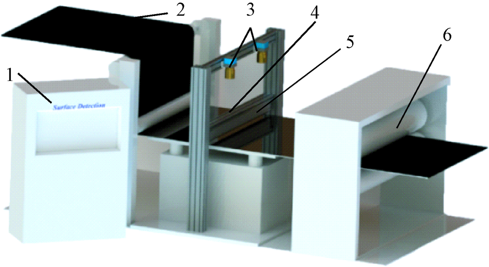 碳纤维预浸料的表面缺陷检测系统 1—工控机; 2—碳纤维预浸料; 3—线扫相机;4—编码器; 5—光源; 6—滚筒。"
