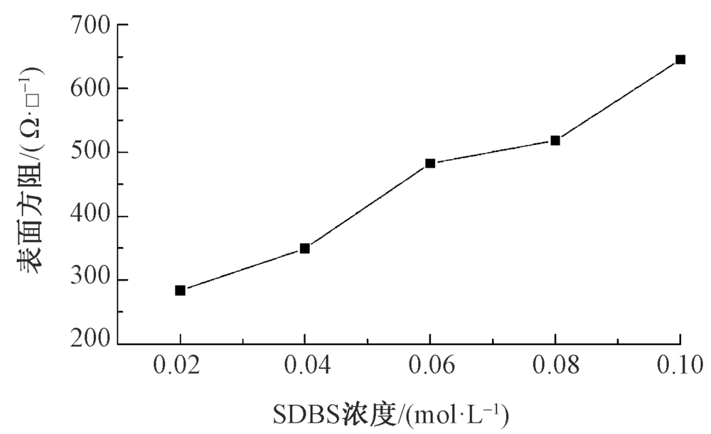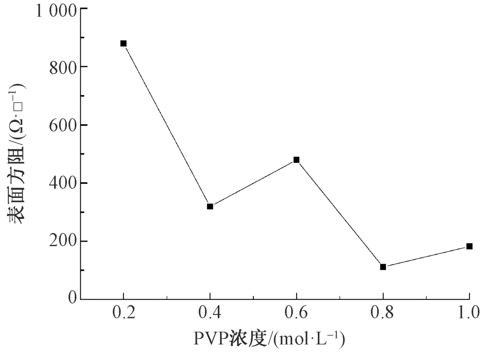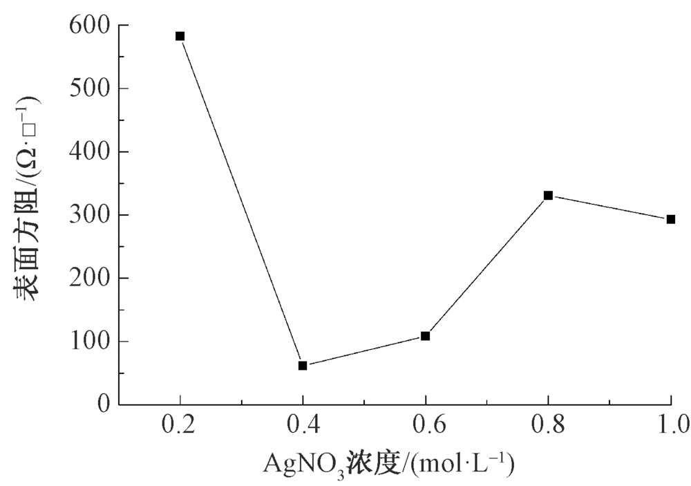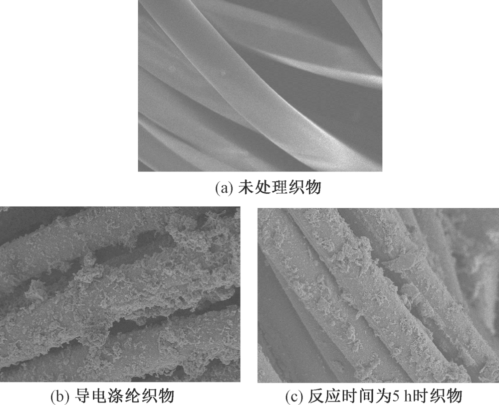 为得到导电性能优良的涤纶织物,在紫外线辐照下通过原位聚合法制备聚吡咯/银导电涤纶织物。探讨了AgNO3浓度、十二烷基苯磺酸钠(SDBS)浓度、聚乙烯吡咯烷酮(PVP)浓度和反应时间对聚吡咯/银(PPy/Ag)导电涤纶织物导电性能的影响,并探究其最佳制备工艺。结果表明:当低温真空等离子体处理功率为220 W,处理时间为4 min,AgNO3浓度为0.4 mol/L,SDBS浓度为0.02 mol/L,PVP浓度为0.8 mol/L,反应时间为8 h时,所制得的导电涤纶织物表面方阻最小,为61.54 Ω/□,且表面具有1层连续的聚吡咯导电薄膜;导电涤纶织物表面存在纳米银颗粒,其具有良好的抗菌性,对大肠杆菌和金黄色葡萄球菌的抑菌带宽度均大于1 mm。