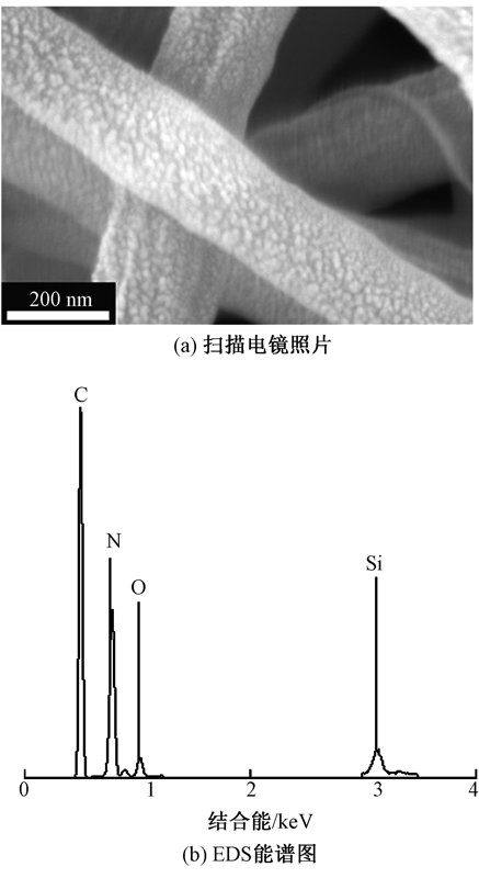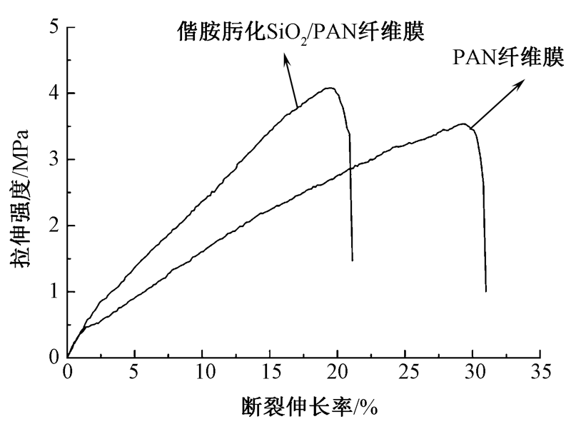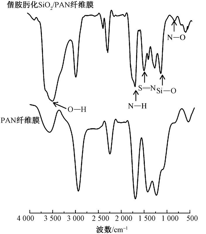为构筑具有特殊表/界面性能的膜材料,利用静电纺丝技术制备SiO2/聚丙烯腈(PAN)复合纤维膜,然后经盐酸羟胺偕胺肟化处理赋予其超亲水及水下超疏油性能。借助场发射扫描电子显微镜、X射线能谱仪、傅里叶变换光谱仪及接触角测试仪等分析了纤维膜的微观形貌、结构和表/界面性质。结果表明:偕胺肟化改性后纤维膜表面有絮状物包覆,盐酸羟胺改性液最佳质量浓度为35~40 g/L,最佳改性温度为60 ℃,偕胺肟化SiO2/PAN纤维的平均直径为275 nm;改性后纤维膜表面Si和O元素质量分数为2.13%和6.60%,SiO2锚固在PAN纤维膜表面,且SiO2/PAN偕胺肟化成功;相比PAN纤维膜,SiO2/PAN纤维膜在60 ℃偕胺肟化后水润湿时间由5.4 s缩短到0.5 s,且水下油接触角达到(165.2±1)°;偕胺肟化纤维膜断裂强度达4.1 MPa,可满足油水分离的基本要求。