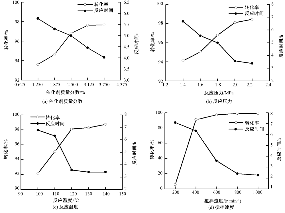 In order to meet the requirements for clean production and to improve the reaction rate and conversion rate of T-acid synthesis, the nickel-aluminum alloy powder was used as the catalyst precursor to prepare the Raney nickel catalyst by sodium hydroxide activation. The prepared structure and properties of the materials were studied by means of scanning electron microscope, X-ray diffractometer, specific surface area and pore structure tester and Zeta potential tester, and so on, and its application in the preparation of T-acid by hydrogenation reduction of nitro T-acid was investigated. The results show that the prepared Raney nickel catalyst is rich in pore structures, mainly mesopores, with a specific surface area of 46.88 m2/g and an average grain size of 15.8 nm. The optimum application process of the prepared Raney nickel in the hydrogenation reduction of nitro T-acid is as follows: catalyst dosage 2.500%, reaction pressure 2.0 MPa, reaction temperature 120 ℃, stirring speed 800 r/min. Under the best process conditions, the conversion of nitro T-acid reaches 99.07%, and there is no obvious deactivation after ten times of reuse.