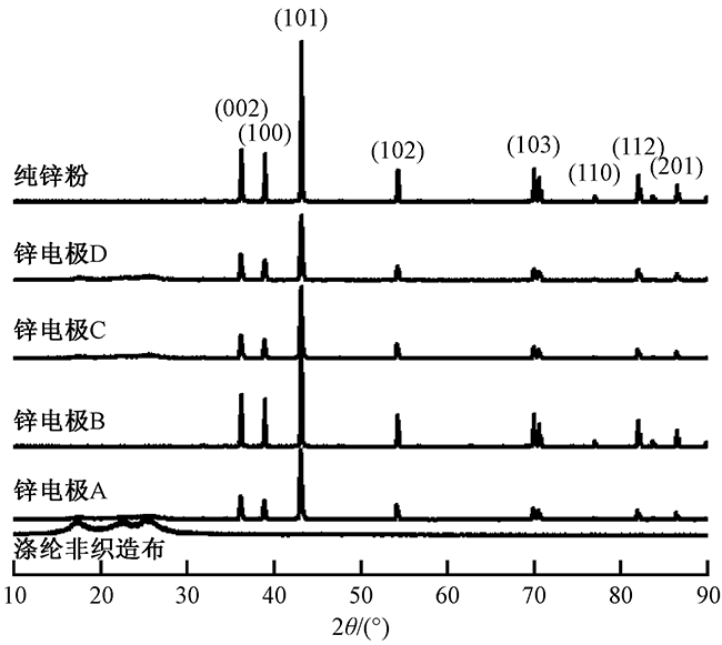 不同锌电极与纯锌粉及涤纶非织造布的XRD图"