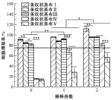 基布的倍比稀释细胞增殖率 注:标注线为不同水平间相互对比的显著性分析,星号越多显著性越强。"