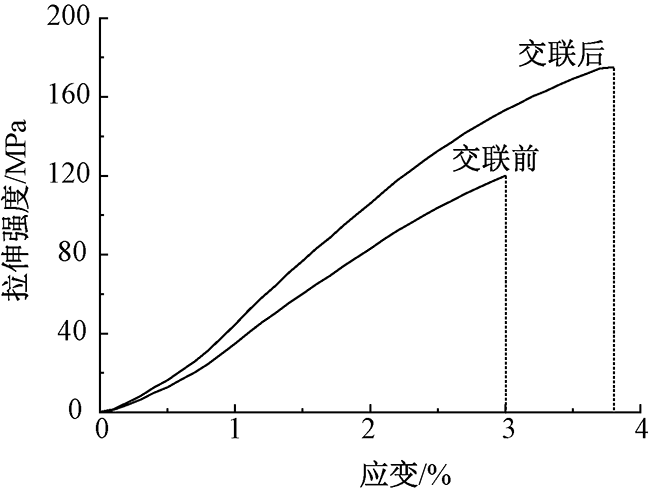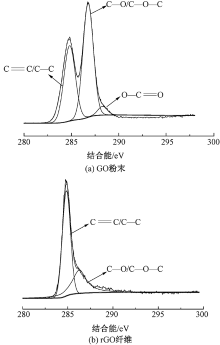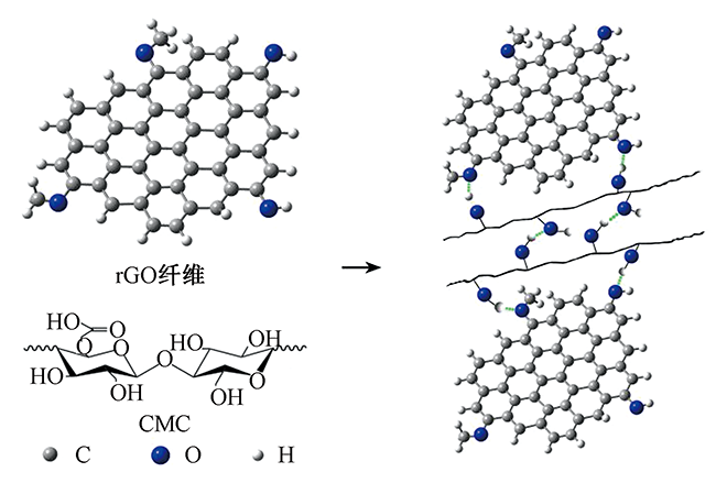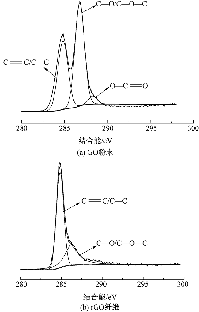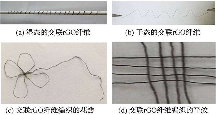 为制备兼具导电性和柔韧性的石墨烯纤维,首先采用改进的Hummers法制备氧化石墨烯,然后以氧化石墨烯溶液为纺丝液,CaCl2的乙醇溶液为凝固浴,通过湿法纺丝后经氢碘酸还原制备得到石墨烯纤维;并以羧甲基纤维素为交联剂对石墨烯纤维进行改性处理,得到交联石墨烯纤维。最后对2种石墨烯纤维的表面形态、导电性和力学性能进行测试与分析,并初步应用。结果表明:制备的氧化石墨烯含氧量为31.37%,单片层厚度为0.88 nm;2种石墨烯纤维表面均较光滑,交联石墨烯纤维内部片层排列更加紧密,其电导率达124 S/cm,与交联前的石墨烯纤维相差不大,但拉伸强度由交联前的120 MPa增加至179 MPa;单根交联石墨烯纤维作为电路导线可点亮灯泡,且可任意弯曲打结编织成花瓣及平纹网状结构。