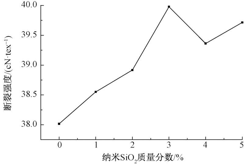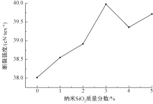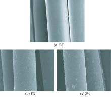 为提升玄武岩纤维与基体的界面相容性,采用偶联剂KH550改性后的纳米SiO2对玄武岩纤维表面进行粗糙化改性处理。分析了改性前后玄武岩纤维的表面形貌和化学结构,研究了纳米SiO2质量分数对玄武岩纤维力学性能、摩擦因数、吸湿性能的影响。结果表明:经纳米SiO2改性后,玄武岩纤维表面的粗糙度和比表面积增大,摩擦性能和吸湿性能显著增加,在纳米SiO2质量分数为5%时,玄武岩纤维摩擦因数由0.255提升至0.280,透湿率也提高至0.65%;与未改性的玄武岩纤维相比,改性后的玄武岩纤维表面出现了C—H键,且Si—O—Si键对应的振动峰强度变强,提高了纤维表面的极性;改性后玄武岩纤维的拉伸力学性能有一定提高,随着纳米SiO2质量分数的增加,玄武岩纤维的力学性能先上升后下降,当纳米SiO2质量分数为3% 时,其拉伸断裂强度最高可达40 cN/tex。