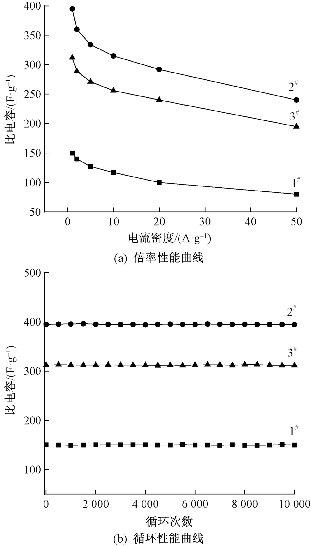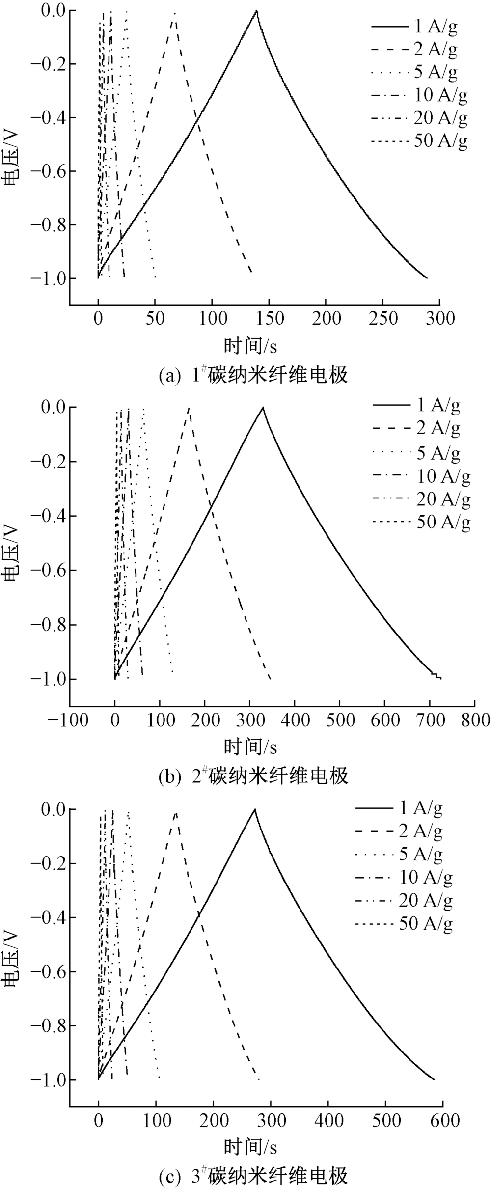 为研究炭化温度对碳纳米纤维电极性能的影响,采用静电纺丝法制备了聚丙烯腈/线性酚醛树脂(PAN/PF)纳米纤维,然后经不同温度炭化处理得到不同结构与性能的碳纳米纤维,并制备成电极材料。对碳纳米纤维的表面形貌、比表面积、孔结构、石墨化程度和元素含量,以及碳纳米纤维电极的电化学性能进行测试与表征。结果表明:PAN/PF碳纳米纤维具有高的比表面积、分级多孔结构、良好的纤维连通以及优异的石墨化程度;当炭化温度为1 000 ℃时,碳纳米纤维的比表面积达到1 468 m2/g,总孔体积为0.89 cm3/g,相应电极的比电容达到395 F/g;当炭化温度为1 200 ℃时,碳纳米纤维的导电性能最佳,电导率为8.23 S/cm,其制备的电极材料具有最高的比电容保持率,为63%。