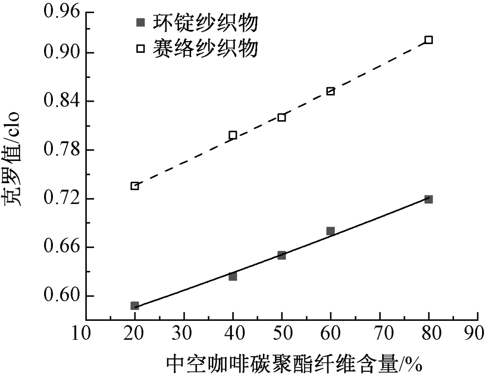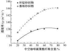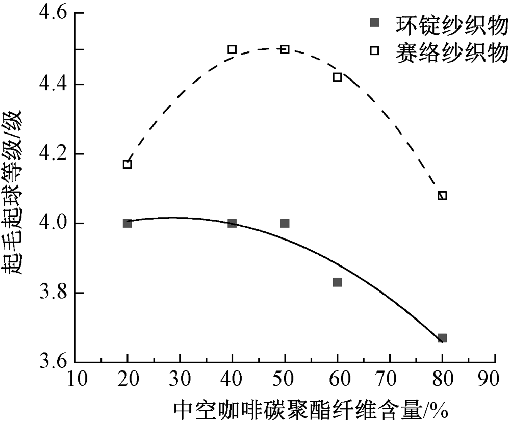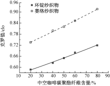为研究中空咖啡碳聚酯纤维含量对其纬平针织物服用性能的影响,设计了5种不同混纺比中空咖啡碳聚酯纤维/棉纤维,采用环锭纺与赛络纺纺制了10组18.3 tex混纺纱,并织成相同规格的纬平针织物。测试并分析织物的顶破、起毛起球、透气、透湿及保暖性能。基于回归分析,获得了中空咖啡碳聚酯纤维含量与织物各性能指标的关系,并建立了综合性能评价函数对织物的服用性能进行评价。结果表明:随着中空咖啡碳聚酯纤维含量的增加,混纺纬平针织物的顶破强力、透气、透湿、保暖性增加,抗起毛起球性能变差,赛络纱织物的综合性能优于环锭纱织物;中空咖啡碳聚酯纤维/棉混纺织物相比于普通涤/棉织物,透气性能可提高66%,透湿性能提高10%,保暖性能提高2.6倍。