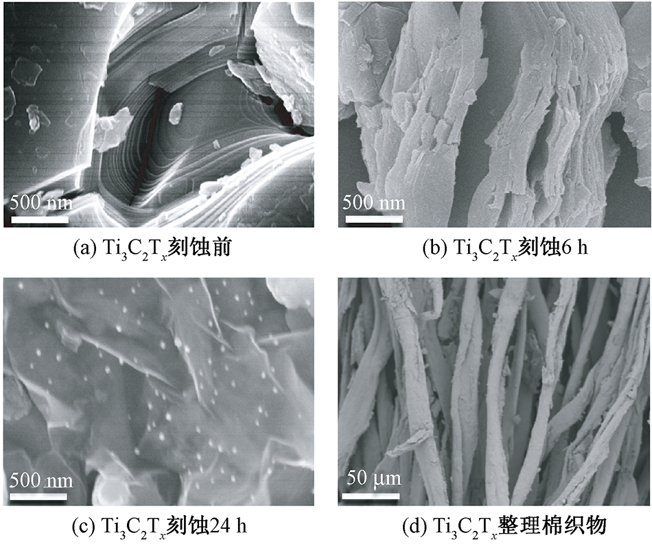 不同刻蚀阶段Ti3C2Tx及其整理的织物的SEM照片 "
