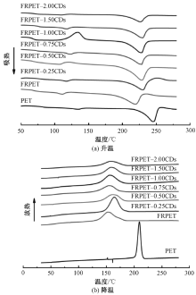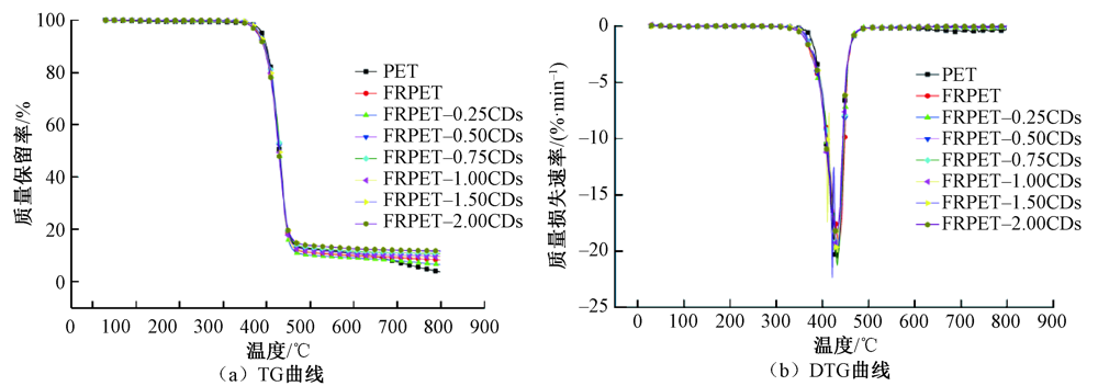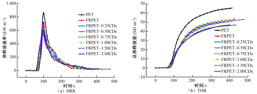 为探究零维碳纳米材料碳点(CDs)对阻燃聚对苯二甲酸乙二醇酯(FRPET)热力学性能、阻燃性能、力学性能及荧光性能的影响,将对PET具有良好阻燃效果的共聚型阻燃剂2-羧乙基苯基次膦酸(CEPPA)与碳点同时采用原位聚合的方式添加到PET基体中,研究碳点添加量对FRPET各项性能的影响规律。通过极限氧指数(LOI值)、垂直燃烧(UL94)、锥形量热(CONE)等测试分析不同碳点添加量对FRPET的性能影响。结果表明:在碳点添加量为1.50%时,FRPET的LOI值最高可达34%,垂直燃烧级别为V-0级,较只添加CEPPA的FRPET引燃时间变长、热释放速率峰值与平均热释放速率及总热释放量均降低;加入CDs后FRPET的力学性能也有很大改善,且赋予了荧光性能,有益于拓宽FRPET的应用领域。