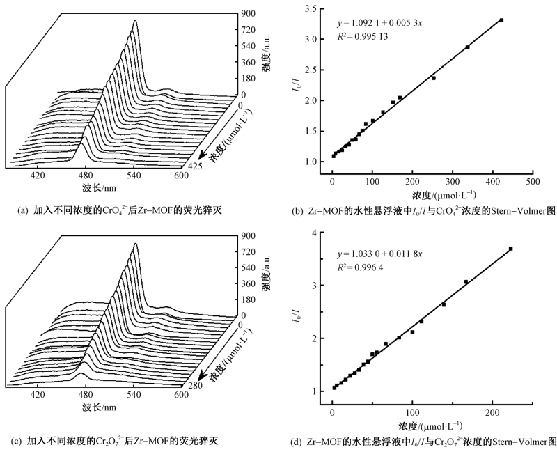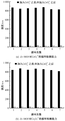 HE T, ZHANG Y Z, KONG X J, et al. Zr(IV)-based metal organic framework with T-shaped ligand: unique structure, high stability, selective detection, and rapid adsorption of Cr2O72-in water [J]. ACS Applied Materials & Interfaces, 2018,10(19):16650-16659.