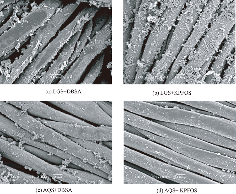 为提高纺织品的多功能性如导电和疏水性等,在棉织物表面合成了疏水导电高分子材料聚吡咯。通过加入低表面能的掺杂剂来调控聚吡咯的疏水性与导电性,并对聚吡咯整理棉织物的表观形貌、电导率、接触角及K/S值等进行表征。结果表明,以木质素磺酸钠(LGS)为模板,掺杂 0.025 mol/L全氟辛基磺酸钾(KPFOS)制得的聚吡咯整理棉织物疏水性能最佳,且达到超疏水状态;以蒽醌-2-磺酸钠盐(AQS)为软模板、掺杂十二烷基苯磺酸(DBSA) 的聚吡咯复合棉织物电导率最大。以AQS为软模板且以0.01 mol/L DBSA掺杂的聚吡咯整理棉织物综合性能较好: 接触角为131.2°,电导率为61.4 S/cm。因此通过模板的微观形貌控制以及烷基链或全氟烷基链的掺杂,可得到同时具备良好导电和疏水性能的聚吡咯整理棉织物,但其掺杂剂的调控机制仍需进一步研究。