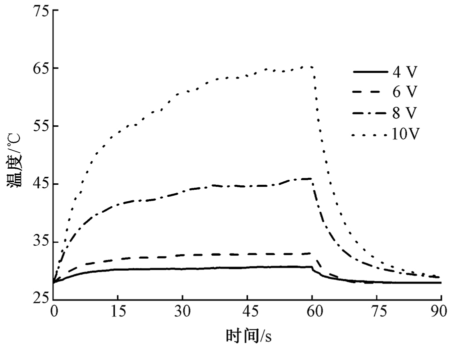RGO涂层涤纶织物在不同电压下的温度与时间曲线"