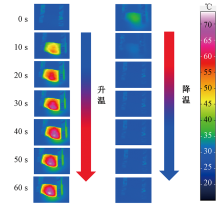 10 V电压下RGO涂层涤纶织物在60 s内的升温和降温的红外热像图"