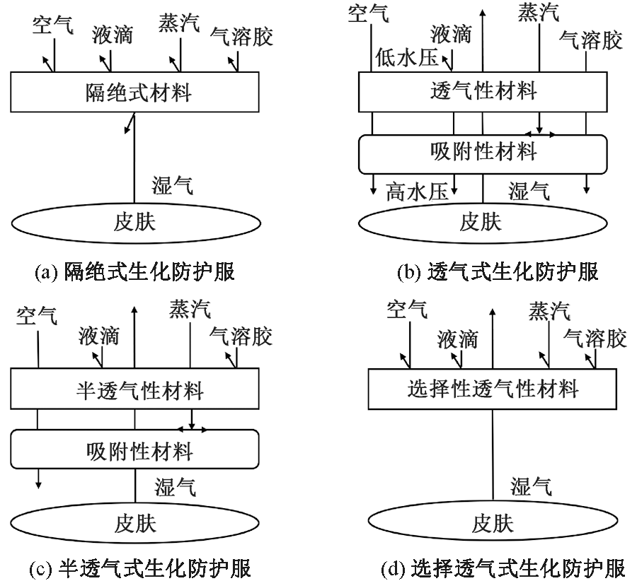 为了全面了解生化防护服的各项性能要求,首先介绍了4种生化防护服的类别和透湿机制;其次列举了橡胶基防护材料、离子交换膜材料、消毒高分子材料和其他高分子复合材料等用于生化防护服主要材料的研究进展,重点展示了生化防护服的研究现状。然后总结了应用于生化防护服的新型技术,包括自修复技术和静电纺丝技术,为生化防护服的发展提供了新的思路。最后根据生化防护服的发展状况总结了当前面临的问题,并对未来的研究趋势做出展望。研究表明:尽管目前生化防护材料发展迅速,但其产业化仍面临诸多问题,现有的各类生化防护服优缺点明显,未来应侧重于防护范围和性能的扩大与提升,并使其向舒适化及智能化发展。