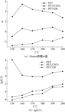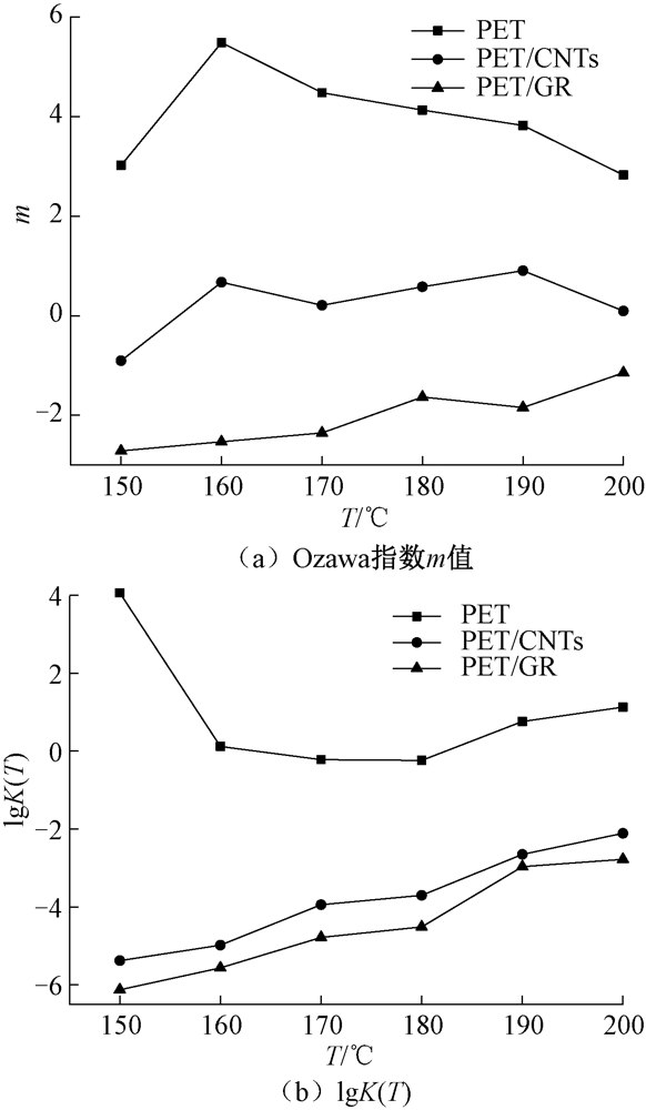针对聚对苯二甲酸乙二醇酯(PET)中的导热结构会影响纤维材料加工成形、纺织品加工过程以及纤维性能的问题,通过熔融共混法分别制备得到含有碳纳米管、石墨烯的PET复合材料,借助差示扫描量热仪对PET的非等温结晶动力学进行研究。结果表明:掺杂的碳纳米管、石墨烯在PET中起成核剂作用,其质量分数的增加对PET的结晶温度、结晶速率及结晶度具有促进作用;由Kissinger方程计算得到的纯PET和掺杂碳纳米管、石墨烯的PET复合材料的结晶活化能分别为-95.23、-160.27和-176.79 kJ/mol,结晶活化能的绝对值增加促进大分子分子链运动而使结晶过程放热加快;碳纳米管、石墨烯对PET的结晶速率、成核具有促进作用,其中石墨烯的二维片状导热结构对PET的结晶更有利。