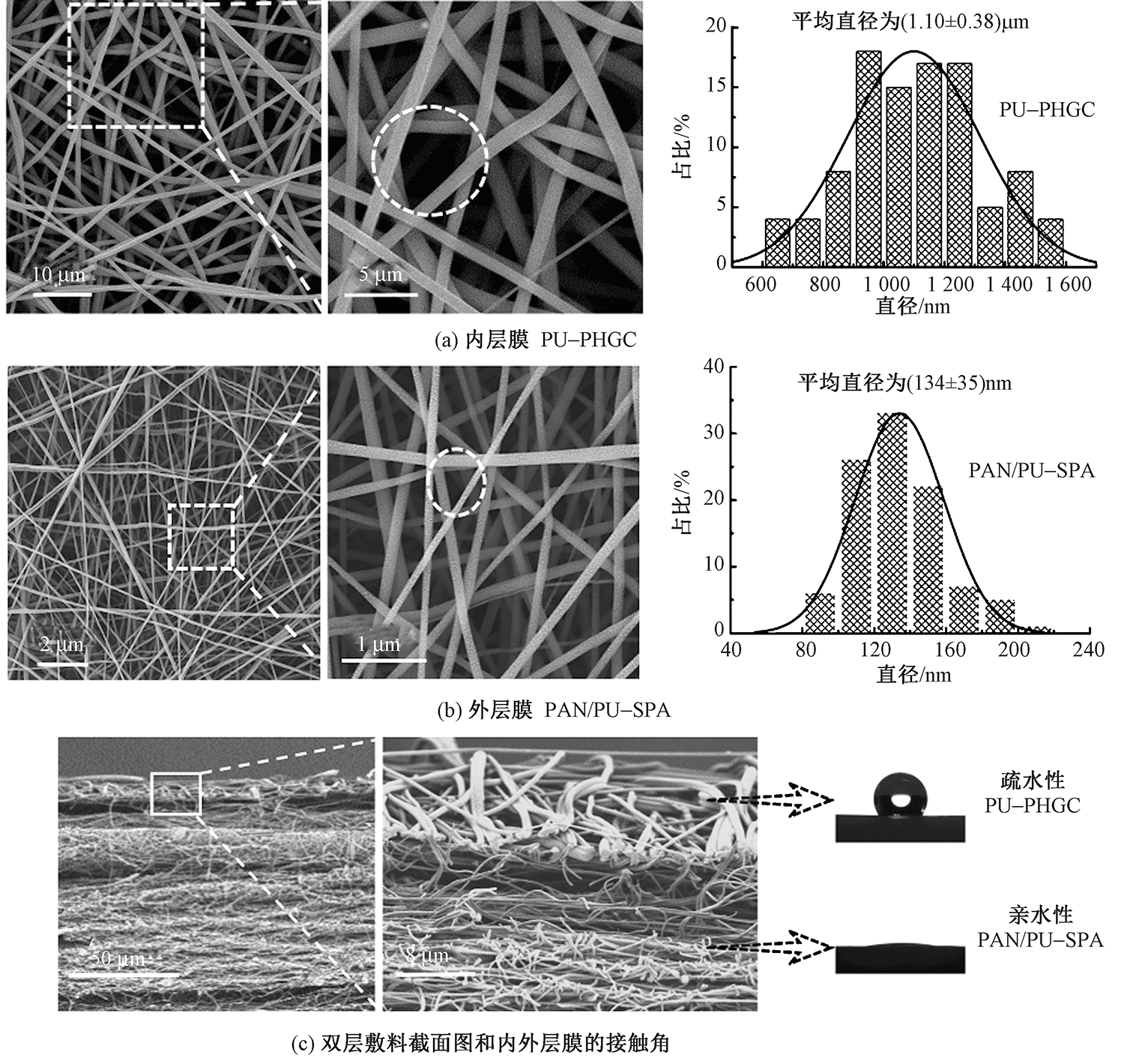 双层纳米纤维敷料的形貌、直径分布图及其水接触角"