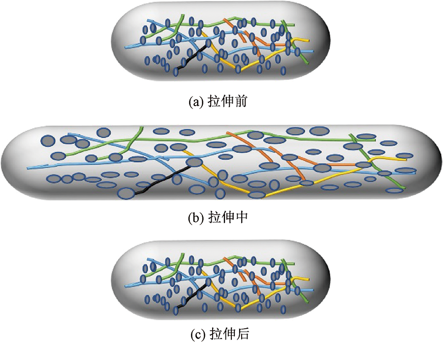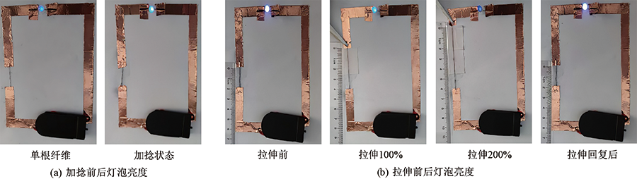 为改善碳纳米管(CNT)作为导电填料弹性性能不足的问题,以CNT和液态金属(LM)为导电填料,热塑性聚氨酯(TPU)为基体,选用N,N-二甲基甲酰胺(DMF)作为溶剂,去离子水为凝固浴,通过湿法纺丝制备了CNT/LM/TPU导电纤维,并研究了LM和CNT 2种导电填料对纤维结构和性能的影响。结果表明:当导电填料LM质量分数为40%,CNT质量分数为10%时,CNT/LM/TPU纤维的力学性能大幅度提升,断裂强度为10.16 MPa,断裂伸长率为252%;CNT/LM/TPU纤维具有良好的导电性能,其电导率为5.41 S/m,可以用作导线点亮电路,在100%和200%的拉伸应变下电路仍有电流通过,且经20次循环拉伸后仍具有稳定的电阻回复性;此外,该纤维还具有良好的抗菌性能,对金黄色葡萄球菌的抑菌率达到92.61%。