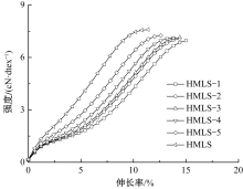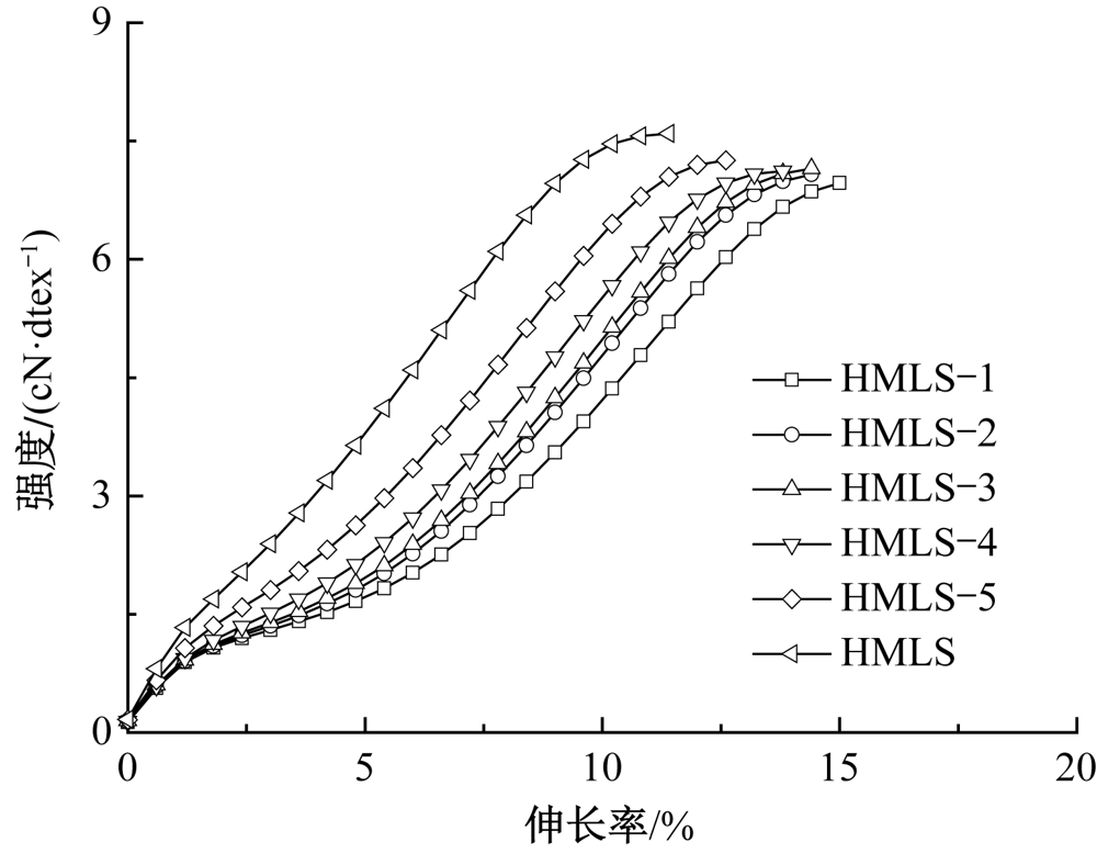 不同热处理张力下HMLS工业丝的强度-伸长率曲线"