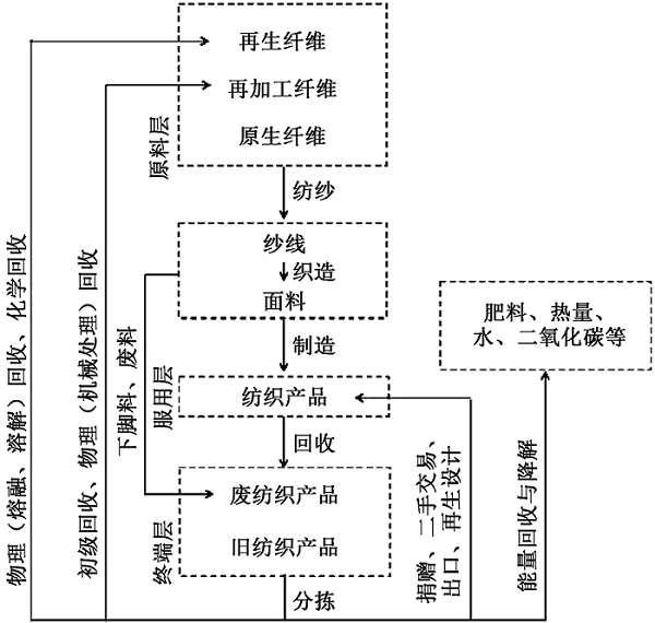 为实现纺织废弃物的循环再利用,促进纺织产业链闭环系统的构建,基于现有研究成果,对当前废旧纺织品的回收框架进行总结,对资源化循环利用方法进行综述,主要包括初级回收、物理回收以及化学回收,并分析了各回收工艺的优缺点;阐述了纤维素纤维、聚酯纤维、蛋白质纤维等纤维及其典型混纺织物的回收处理工艺研究进展,介绍了基于废旧纺织品的功能性材料的制备方法,以及其用于隔声材料、泡沫材料、太阳能蒸发和电容材料等领域的研发进展。最后指出,废旧纺织品的综合评估系统是解决资源化循环利用提速、提质,并实现工业化规模生产的关键。