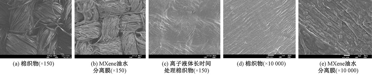 为了开发工艺简单、可重复使用、油水分离效率高的棉基油水分离材料,以实现废旧棉织物的低能耗高附加值利用,通过超声波喷涂的方式将具有亲水性的柔性二维过渡金属碳/氮化物(MXene)纳米片施加于棉织物上,借助离子液体对棉纤维的溶胀作用以增加棉织物表面的粗糙度,进一步提高MXene在棉织物上的固载率,制备棉基MXene油水分离膜。借助扫描电镜和接触角测试仪等分析油水分离膜的表面形貌和润湿性能。对棉基MXene油水分离膜的油水分离效率、膜通量、耐酸碱性和可循环使用性进行了测试。结果表明:以棉织物为基体的MXene油水分离膜的分离效率最高,可达99.1%;10次重复实验后仍具有98.6%的分离效率;在pH值为1~13的范围内分离效率无明显变化,空气中水接触角为30°,保持了原棉织物80.1%的强力。
