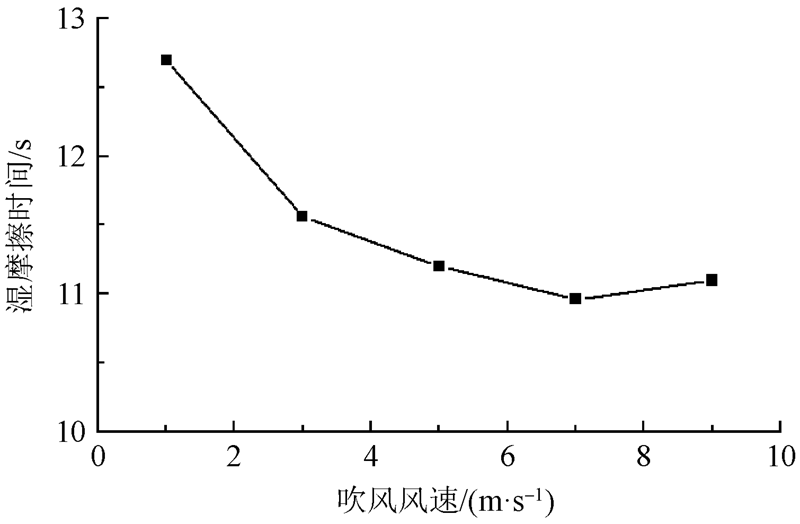 Lyocell纤维湿摩擦时间随吹风风速的变化"