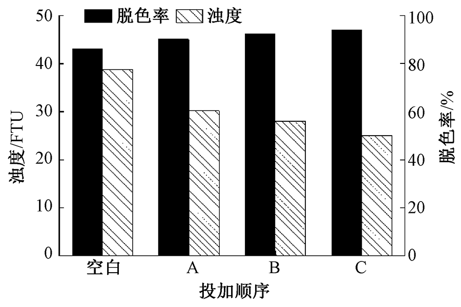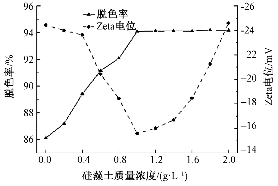 为提高靛蓝染色废水电絮凝处理效率,以天然黏土矿物为协同吸附剂,采用电絮凝-吸附联合工艺处理靛蓝染色废水。探究黏土类型对絮体沉降速率和Zeta电位的影响,通过废水色度、浊度、脱色率和化学需氧量(COD)去除率评价絮凝处理效果。确定最佳黏土矿物种类并结合絮体显微观察,进一步分析黏土矿物与电絮凝的协同作用机制。结果表明:黏土矿物加入可降低Zeta电位绝对值;硅藻土与电絮凝协同的主要絮凝机制为网捕卷扫,同时兼具一定的电荷中和与吸附架桥作用;电絮凝反应结束后,仅需加入1 g/L硅藻土反应3 min,Zeta电位绝对值可达到最低,为15.585 mV,废水脱色率提升至94.08%。