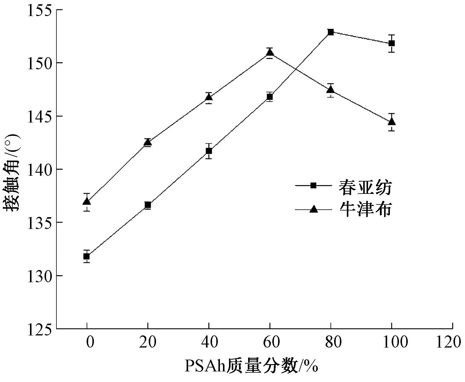 针对含氟拒水整理剂存在生物毒性、耐久性较差等问题,合成了一种聚丙烯酸酯型无氟防水剂。将丙烯酸十八酯(SA)分别与丙烯酸乙基己酯(2-EHA)和甲基丙烯酸环己酯(TMCHMA)进行细乳液聚合,制备了成膜等性能不同的2种SA共聚物胶乳;2种胶乳经复合后用于织物的无氟防水整理,借助原子力显微镜观察了复合胶乳涂膜的表面形貌,研究了复合比例及用量对整理织物表面结构以及防水性的影响。结果表明:与2-EHA共聚可提高胶乳的成膜性,而TMCHMA的引入则可增强胶乳的保形性;2种胶乳复合后,在整理后的织物表面形成微纳疏水结构,整理织物的防水性能显著提升,其静态接触角最高可达152°,防水等级达到5级,经50次耐磨损测试后仍保持良好的疏水性能。