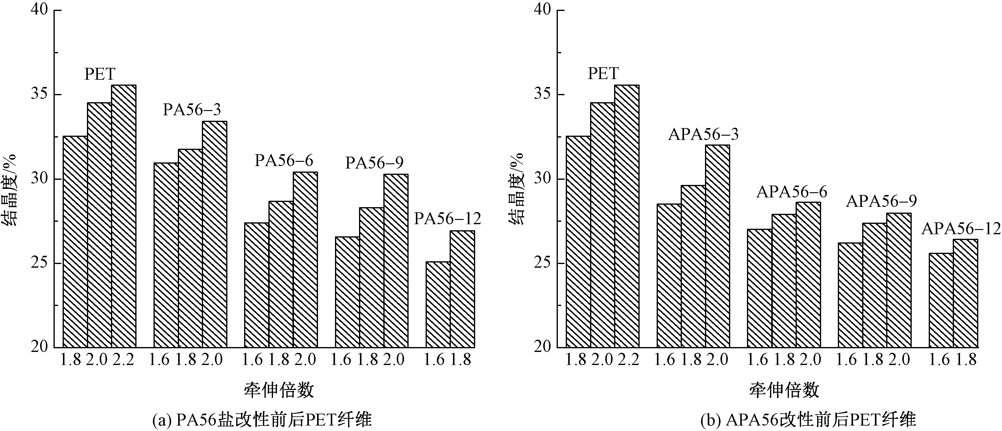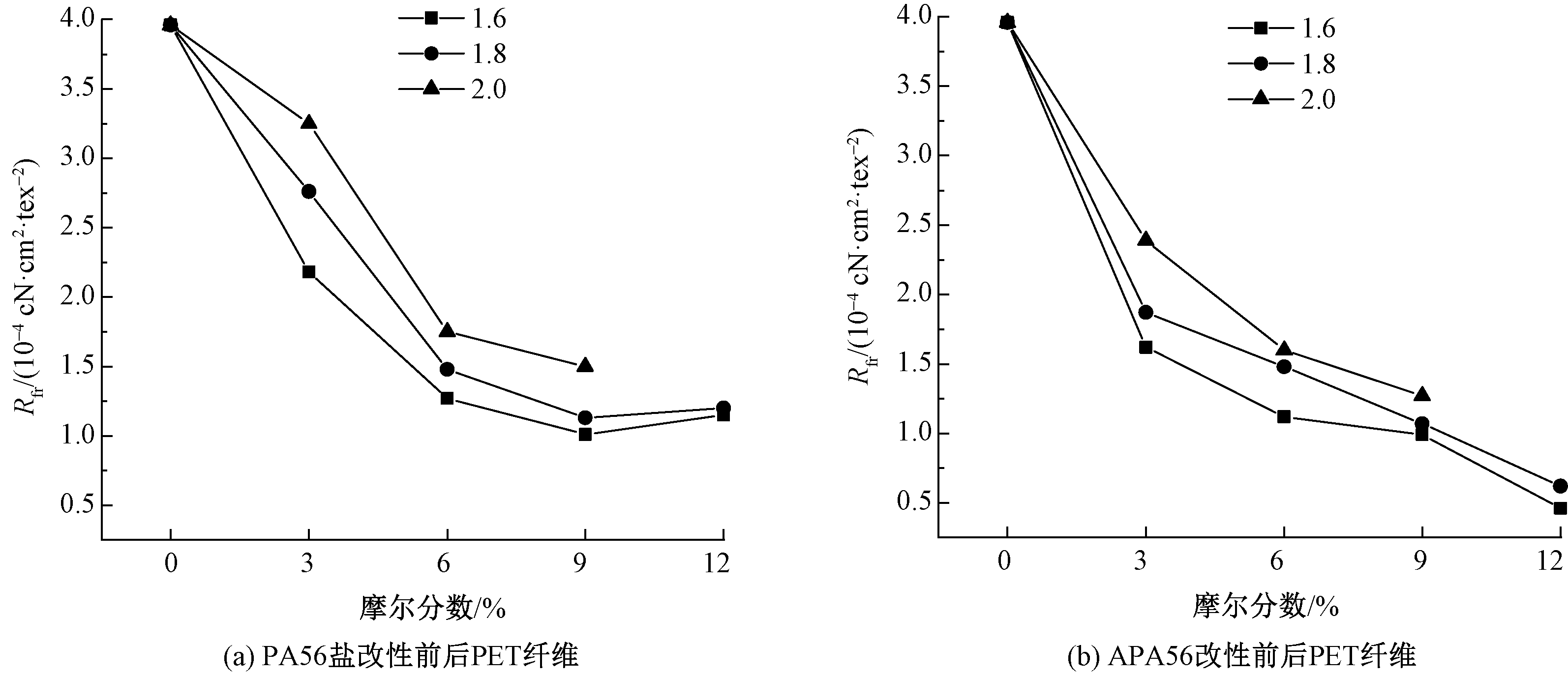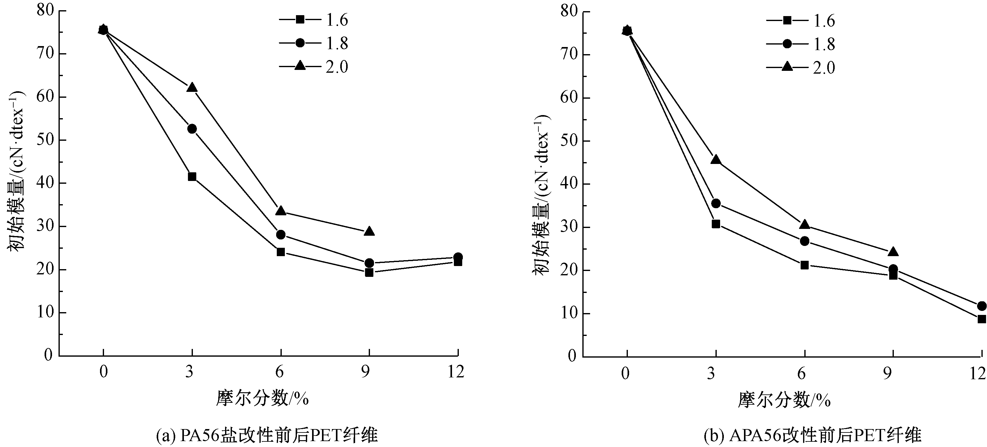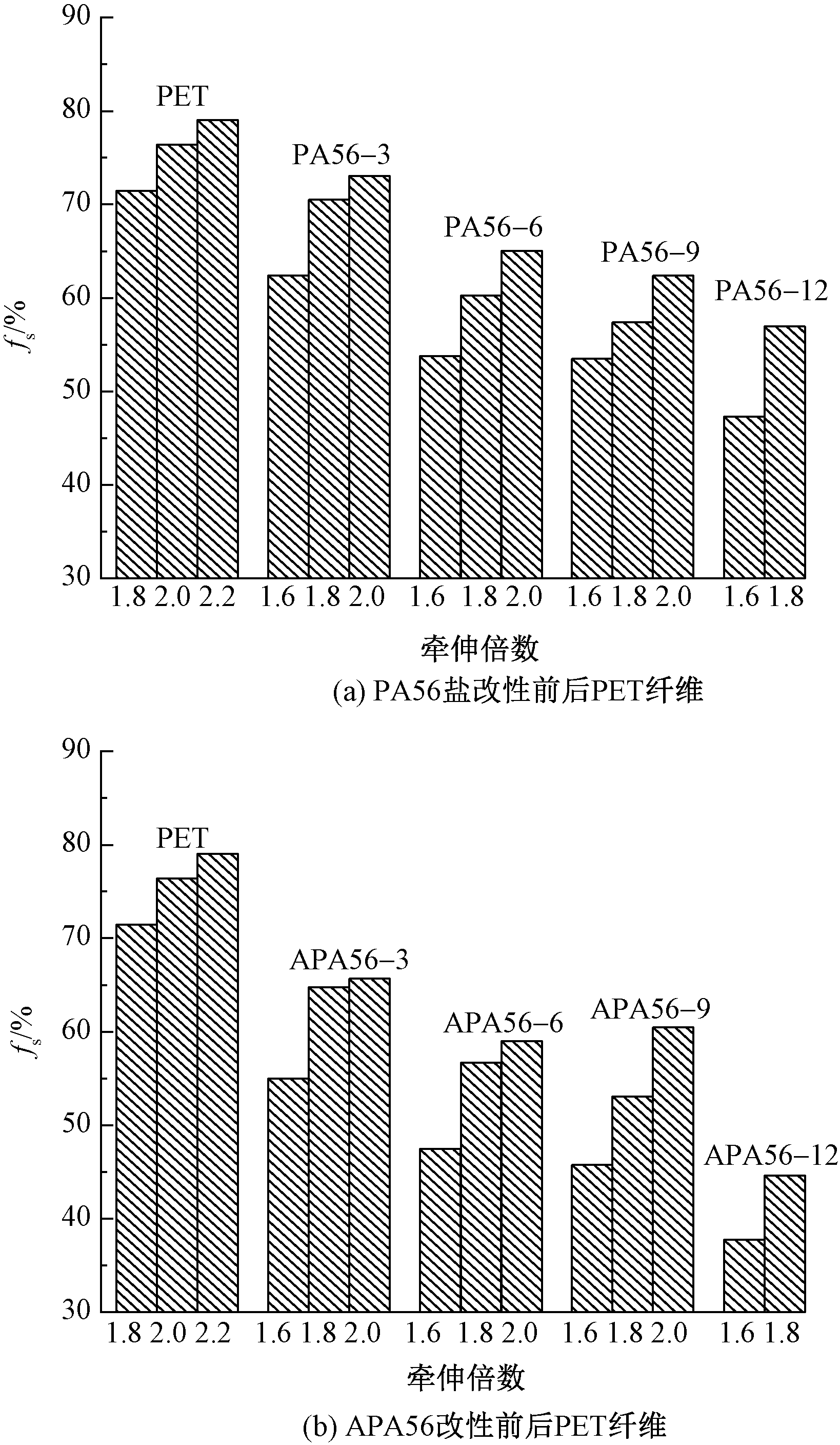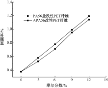 为改善聚对苯二甲酸乙二醇酯(PET)纤维的柔软性和亲水性能,分别以戊二胺己二酸盐(PA56盐)及其衍生物对己二酸戊二酰胺(APA56)为改性单体,与对苯二甲酸乙二醇酯(BHET)共聚并进行熔融纺丝,制备了2个系列的新型改性PET纤维。借助声速取向度测量仪、X射线衍射仪和纱线强伸仪等对改性PET纤维的性能进行测试和分析。结果表明:随着改性单体摩尔分数的增加,PET纤维的结晶度逐渐降低,力学性能有所下降,但当摩尔分数小于6%时,改性PET纤维保留了较好的力学性能;改性单体摩尔分数为3%~12%时,相比于PET纤维,PA56盐和APA56改性PET纤维的回潮率分别提高了39%~200%和53%~213%,相对弯曲刚度分别降低了18%~71%和40%~88%,APA56较PA56盐改性PET纤维的柔软性更好;改性单体摩尔分数达到6%及以上时,改性聚酯纤维的柔软性基本可达到细羊毛水平。