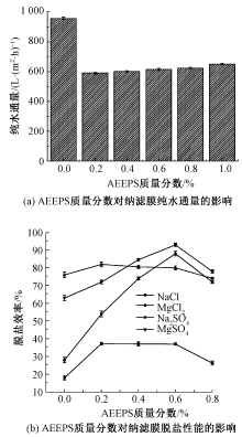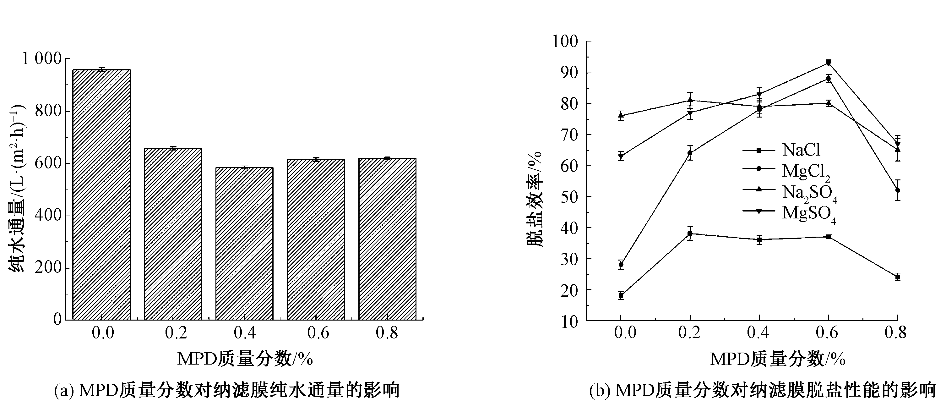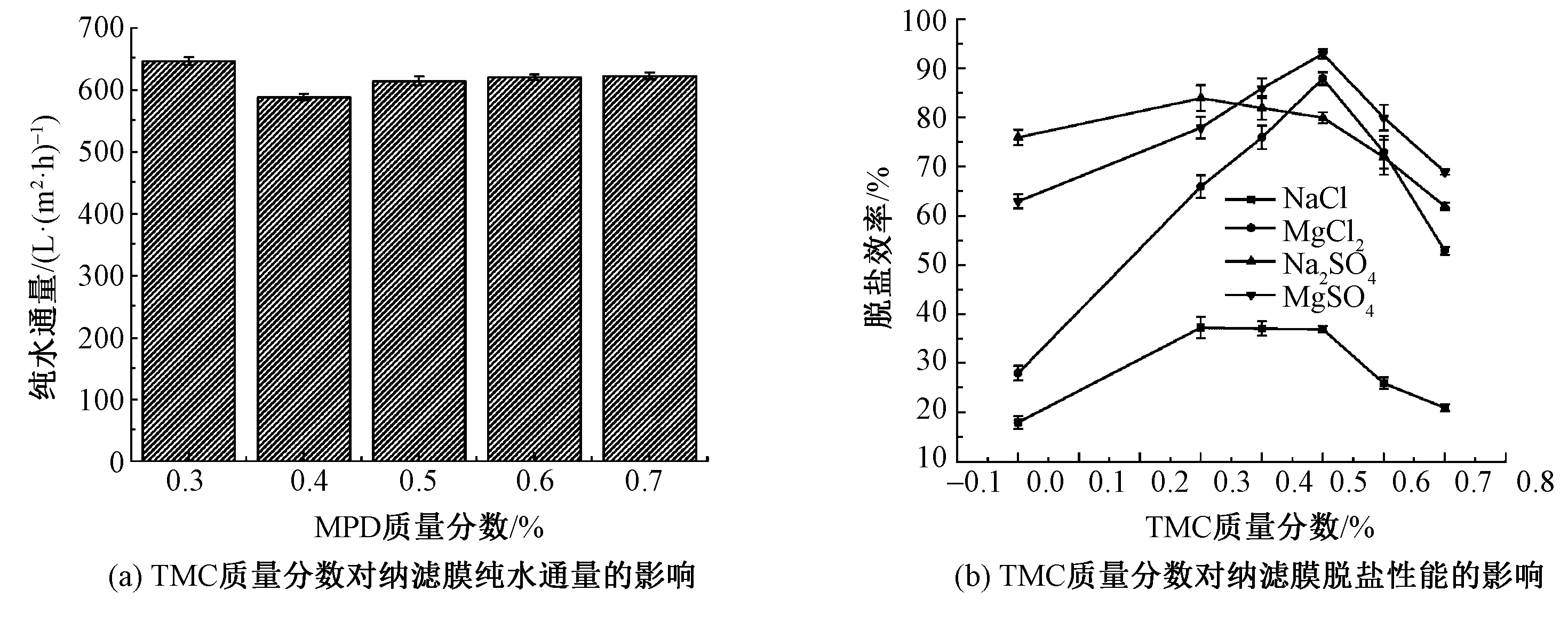 为提高纳滤(NF)膜的离子分离效率,以氯化聚氯乙烯/聚乙烯醇缩丁醛(CPVC/PVB)共混膜作为基膜,利用添加剂聚乙二醇(PEG)、1,2-丙二醇(PG)对基膜进行表面亲水改性。以改性后的CPVC/PVB共混膜作为支撑层,通过水相单体间苯二胺(MPD)与油相单体均苯三甲酰氯(TMC),在反应助剂N-乙基胺哌嗪丙基磺酸盐(AEPPS)的催化下发生界面聚合得到复合NF膜。研究了水相单体MPD质量分数、油相单体TMC质量分数和反应助剂AEPPS质量分数等参数对复合NF膜结构和性能的影响。结果表明:当MPD、TMC、AEPPS的质量分数分别为0.6%、0.5%和0.6%时,纳滤膜表面的三维形貌变得平整,粗糙度降低,结构更加致密,亲水性得以提高;纳滤膜表面形成了荷正电结构致密的聚酰胺分离层,对Mg2+具有较好的分离效果,在水质软化、海水淡化、工业废水处理等领域具有良好的进一步开发与应用前景。