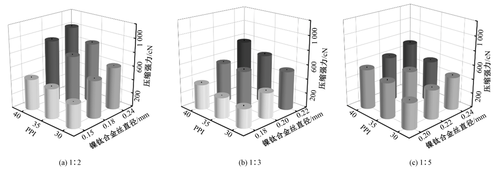 Results The diameter of nickel titanium alloy wire is the main parameter affecting the radial compression force of the esophageal covered stent. Within the scope of this study, the larger the diameter of nickel titanium alloy wire, the better the radial support of the covered stent. Compared with 0.24 mm nickel titanium alloy wire, 0.20 mm and 0.22 mm nickel titanium alloy wires can meet the radial support force required for esophageal stent, and a larger nickel titanium alloy wire diameter reduced the flexibility of the covered stent (Fig.7), so the suitable nickel titanium alloy wire diameter should be 0.20-0.22 mm. PPI has less effect on the radial support and compliance of the covered stent (Fig.4), that when the PPI increases, the radial support of the covered stent is better. When the PPI is 40, the diameter reduction rate increases when it is bent (Fig.7), so the optimal PPI should be 35. The number ratio of the wire essentially refers to the content of nickel titanium alloy wire in the covered stent. The ratio is large, the content of nickel titanium alloy wire is high, and the radial support force of the covered stent is high (Fig.4). However, at the same time, that the diameter reduction rate and elastic straightening force of the covered stent increase, that is, the compliance decreases (Fig.7 and Fig.8). Therefore, the more suitable number ratio should be 1:3. It is comprehensively considered from the perspective of the properties of radial support, bending compliance and lumen conformation of mechanically braided integrated esophageal covered stent, that its optimal parameter combination included the diameter of nickel titanium alloy wire were 0.20 mm and 0.22 mm, PPI was 35, and the number ratio of the wire was 1:3.