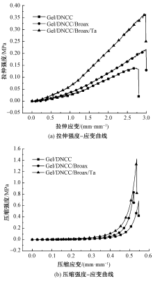 针对水凝胶存在力学性能差、受损后性能难以恢复导致使用寿命短,以及有毒交联剂的使用带来生物相容性差的问题,以明胶(Gel)为基质,双醛纳米纤维素(DNCC)为增强相,通过动态亚胺键形成第一重交联网络,并引入单宁(Ta)和四硼酸钠(Borax)形成多重氢键和动态硼酸酯键,基于动态共价键和氢键协同制备了具有三重交联网络的生物相容性纳米纤维素自愈合Gel/DNCC/Borax/Ta水凝胶,并对其结构和性能进行表征。结果表明:Gel/DNCC/Borax/Ta水凝胶具有良好的热稳定性、柔韧性及可注射性,相比于Gel/DNCC水凝胶,其力学性能和胶体黏弹性明显提高,断裂强度从0.138 MPa增加到0.353 MPa,增加了155.7%,储能模量从960 Pa升高到1 550 Pa, 提升了61.4%;室温环境下,无需外界刺激,受损的水凝胶能够在1 h内快速愈合,愈合效率达到98%;经质量分数0.5%的明胶纤维素复合物浸提液处理72 h后,成纤维细胞凋亡率小于5%,表明Gel/DNCC/Borax/Ta水凝胶具有良好的生物相容性。